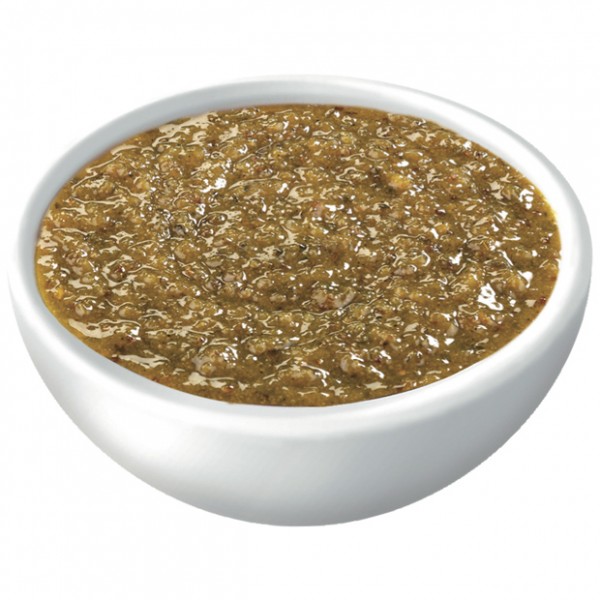 - Gelbliche, cremeartige Masse mit gerebelten Kräutern