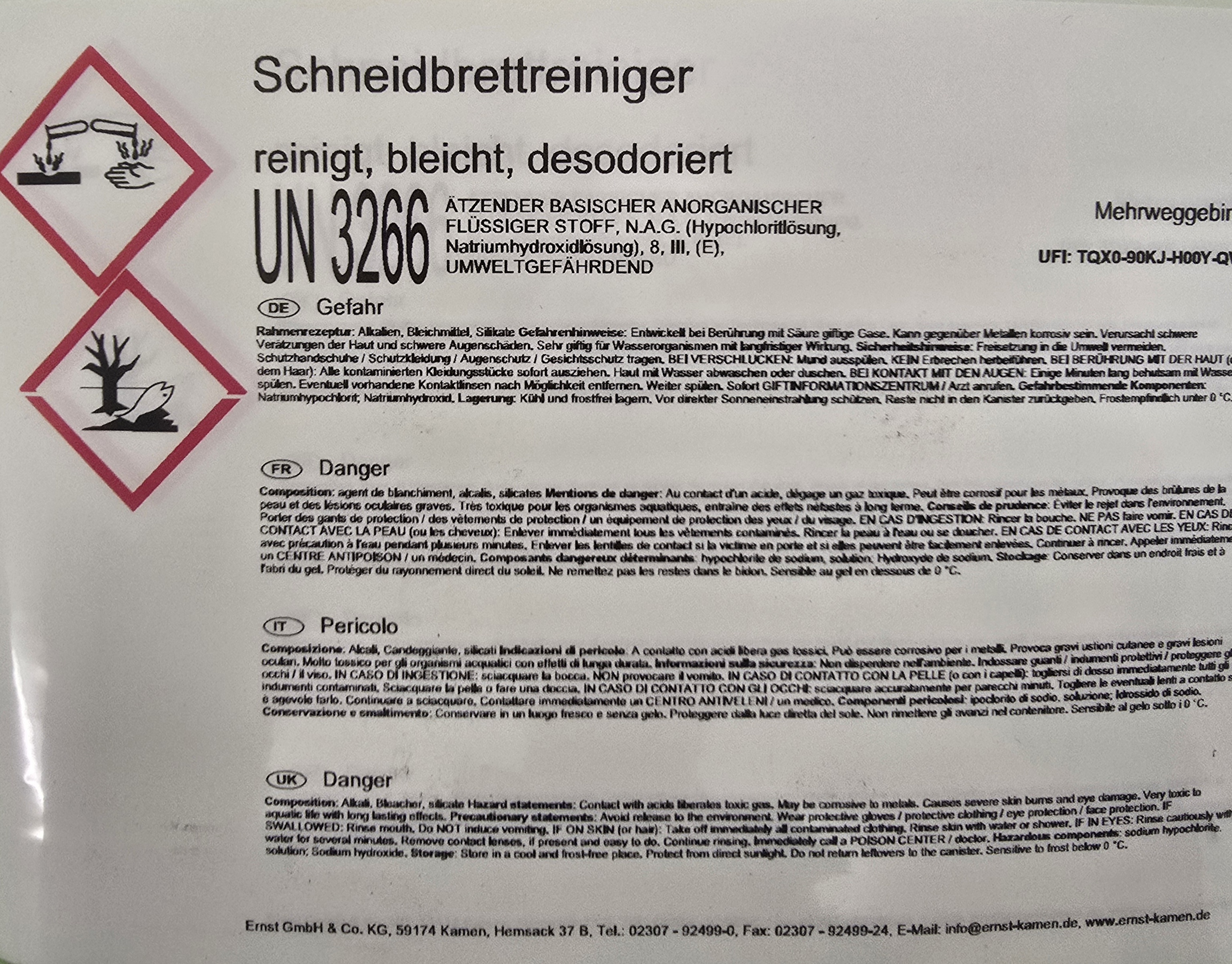 - Inhaltsstoffe: Natriumhypochlorit, Alkalihydroxid, Silikate