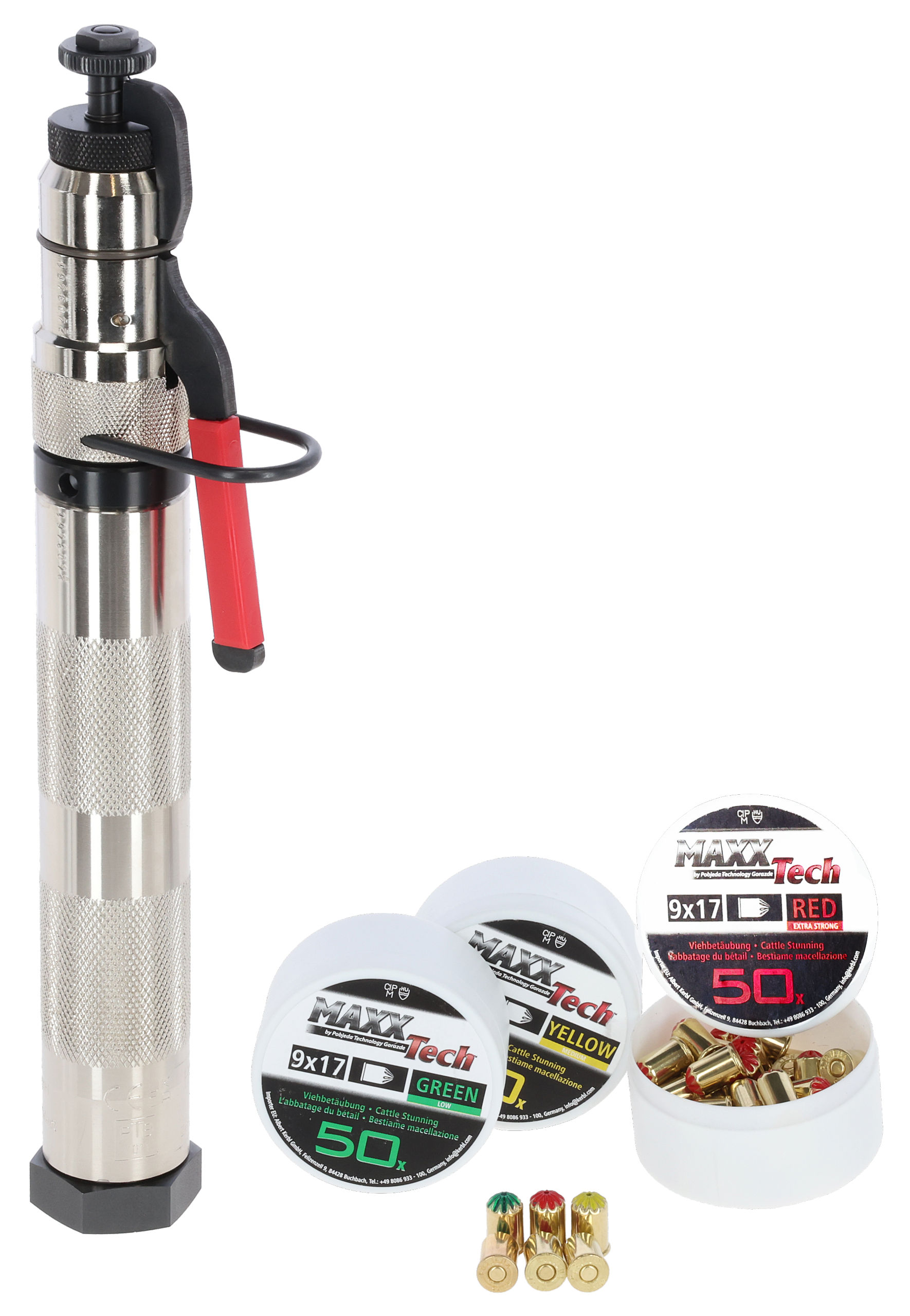Dieses Universalgerät ist zum Betäuben von großen und kleinen Tieren geeignet und als Tierbetäubungsapparat von der physikalisch-technischen Bundesanstalt Braunschweig in Deutschland zugelassen. Die massive Verschraubung gewährleistet einen sicheren Sitz des Verschlussstückes. Das Viehschussgerät mit Zentralfeuer ist äußerst hochwertig ausgeführt, komplett vernickelt und besitzt verstärkte Federn.Sicherheit gegen ungewolltes Abschießen durch Freigabe des Schlagbolzens erst nach völligem Durchdrücken des Abzugshebels. Durch den Sechskant wird ein versehentliches Rollen des Apparates auf den Auslösehebel vermieden. Das Eindringen des Bolzens löst zusätzlich eine Druckwelle aus, die direkt und sofort eine sichere Betäubung des Tieres zur Folge hat. Dadurch kann das Tier schmerzfrei geschlachtet werden. Unverwüstlich mit verstärkten Federn für den rauen Einsatz. Kaliber 9 x 17 mit Zentralfeuer. Neue Sicherheitsfunktionen: Der Schutzbügel verhindert ein ungewolltes Auslösen des Hebels; Das Patronenlager wurde so modifiziert, dass die Vorgaben der C.I.P. (Ständige Internationale Kommission zur Prüfung von Handfeuerwaffen) erfüllt sind und keine längeren Kartuschen (z. B. 9 x 27 mm) eingeführt werden können. Inkl. Reinigungsset.